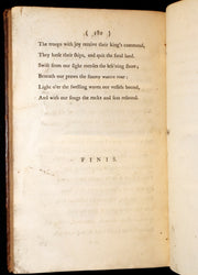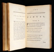 The book: This 1772 Oxford edition of Fingal represents one of the most controversial literary works of the 18th century. Marketed as a lost Gaelic epic by the third-century bard Ossian, it was “translated” by James Macpherson, who claimed to have discovered fragments of ancient poetry in the Scottish Highlands. Fingal quickly caused an uproar in coffee houses and academic circles across Britain, admired for its sublime landscapes and heroic tone, but hotly contested as a possible forgery. Whether authentic or not, the poems inspired an entire generation of Romantic writers and artists across Europe, from Goethe to Napoleon. This copy, handsomely preserved in its original late 18th-century mottled calf binding, offers both literary importance and historical resonance.