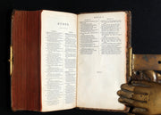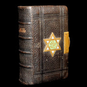 Binding: Attractive and very good original full dark brown textured leather binding, richly tooled in blind with geometric line patterns, gilt “Holy Bible” title on spine. Front board features an elaborate applied brass and enamel Star of David inset with green-enameled “IHS” Christogram, complemented by a working brass clasp. All edges gilt (faded to reddish tone), decorative gilt inner dentelles (hinges fine, overall slightly worn and scuffed - as shown) under a protective removable mylar cover. A beautiful binding!