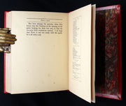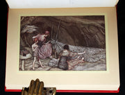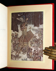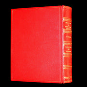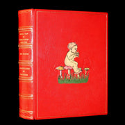 Binding: Attractive and fine binding, finely bound in full red decorative leather, with raised bands, gilt tooling, and gilt titling to spine. Front board features an exquisite inlaid and hand-coloured leather onlay illustration of the infant Peter, inspired by Rackham’s design (hinges fine - as shown) under a protective removable mylar cover. Housed in a fine matching custom red slipcase lined with the original cloth from the publisher’s binding mounted to the front panel. A very beautiful binding!