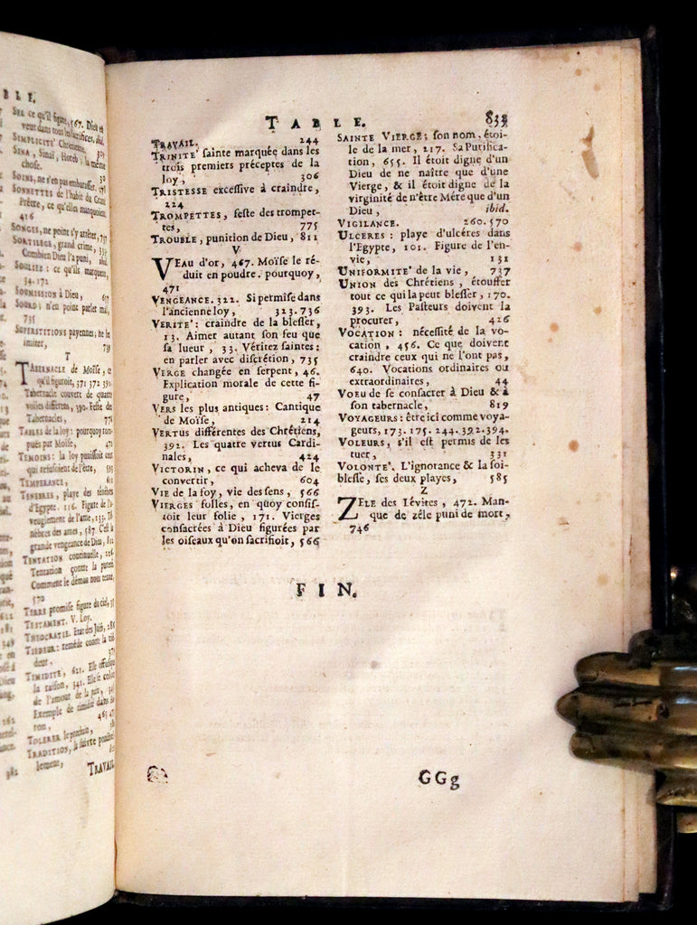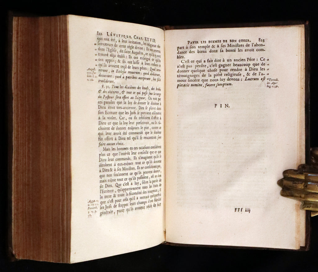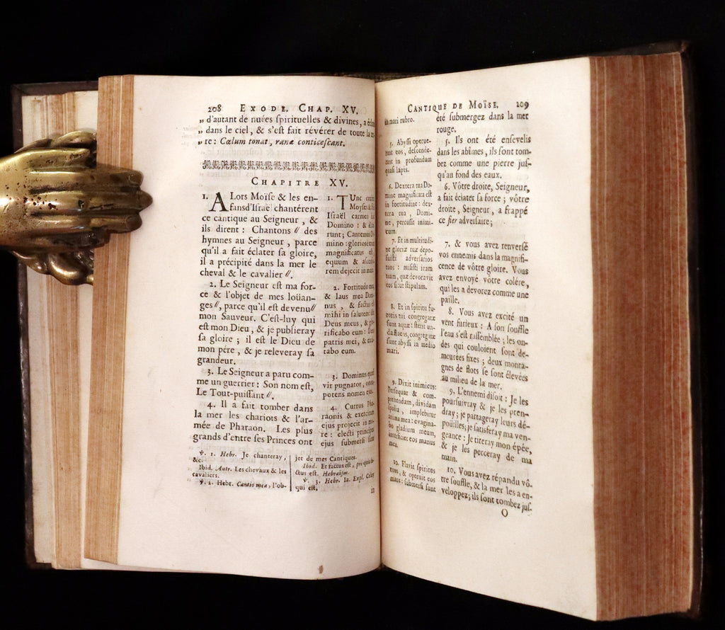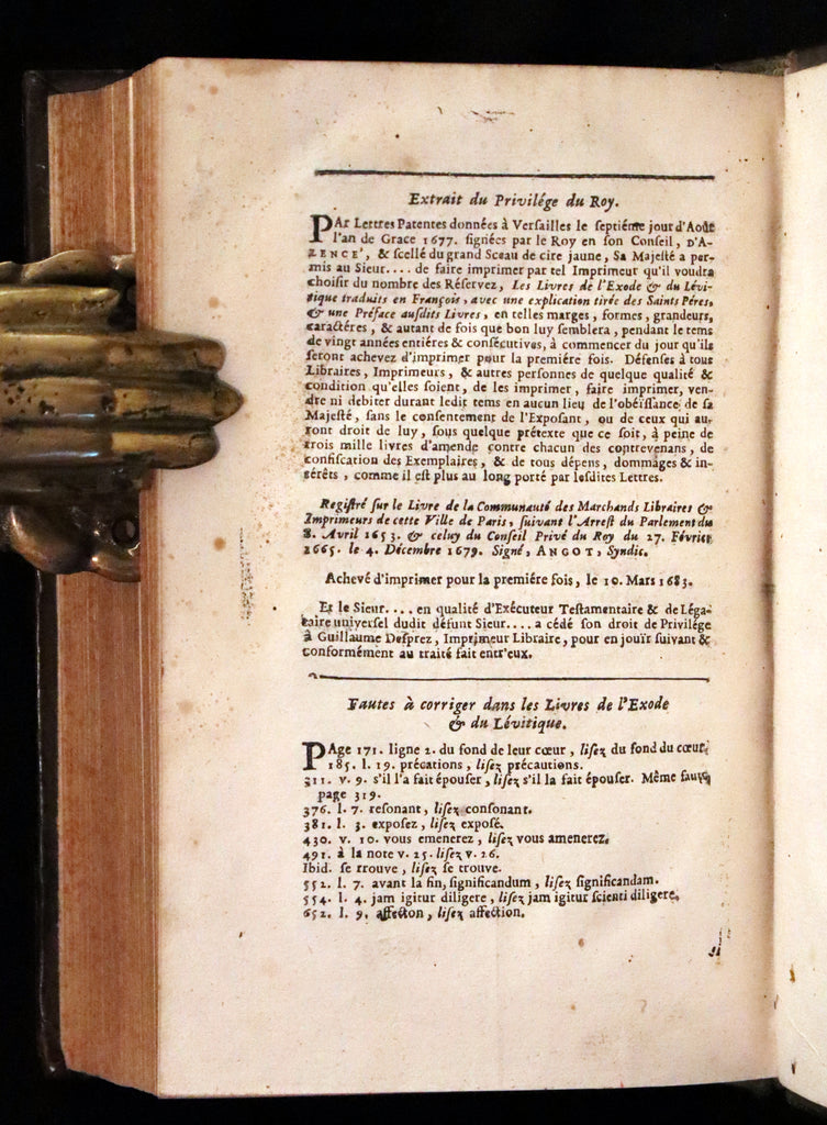 The book: Rare original 17th-century French Latin edition of The Book of Exodus -- the second book of the Bible and describes the Exodus, which includes the Israelites' deliverance from slavery in Egypt through the hand of Yahweh, the revelations at biblical Mount Sinai, and the subsequent "divine indwelling" of God with Israel. AND The Book of Leviticus - the third book of the Torah and of the Old Testament; scholars generally agree that it developed over a long period of time, reaching its present form during the Persian Period between 538-332 BCE.