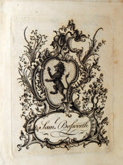 Each volume bears an engraved armorial bookplate on the first endpaper, identifying Samuel Bosworth as an early owner. The finely engraved ex libris, featuring a heraldic lion within an elaborate rococo cartouche, is typical of mid-18th-century English bookplates and adds a clear mark of contemporary provenance.