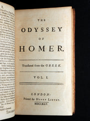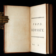 The books: This handsome 1745 five-volume duodecimo set presents Alexander Pope’s celebrated English translation of The Odyssey, one of the most influential and enduring translations of Homer’s epic ever produced. First published between 1725 and 1726, Pope’s version shaped English-speaking readers’ understanding of Homer for generations, admired for its heroic couplets, rhetorical force, and poetic polish.