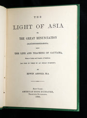 The book: A beautiful early American edition of Sir Edwin Arnold’s The Light of Asia, the celebrated poetic retelling of the life and teachings of Gautama Buddha. First published in London in 1879 and quickly reprinted worldwide, it became one of the most influential literary works of the 19th century to introduce Buddhism to Western readers.
