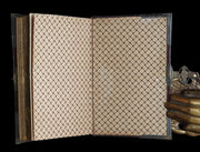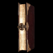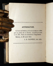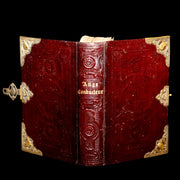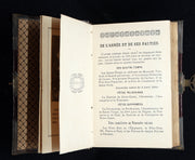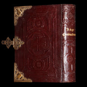 Binding: Attractive and very good original full burgundy leather binding with richly blind-stamped ecclesiastical motifs and ornate gilt borders. Embellished with all four heavy brass corner-pieces and a working central clasp, complete and functional. Gilt title "Ange Conducteur" on the spine. All edges richly gilt and beautifully engraved with a fleur-de-lys motif, creating a radiant decorative effect when the book is closed. (hinges fine, overall slightly scuffed - as shown) under a protective removable mylar cover. A beautiful and devotional object in itself!