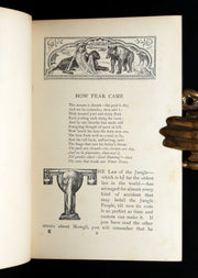 Illustrations: Decorated throughout with black-and-white illustrations and ornamental headpieces, tailpieces, and initials by J. Lockwood Kipling, C.I.E., including jungle scenes, animals, and Indian decorative motifs. These decorations appear in strong impression, consistent with early Macmillan printings.