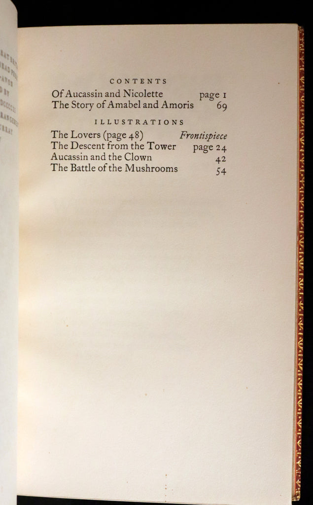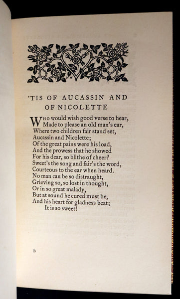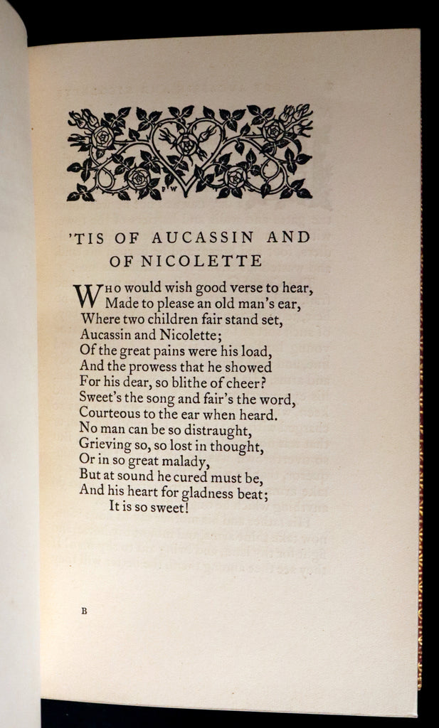 The book: Attractive and fine copy bound by Riviere of Housman beautiful edition of Aucassin et Nicolette (12th or 13th century) the anonymous medieval French fictional story. It is the unique example of a chantefable, literally, a "sung story", a combination of prose and verse (similar to a prosimetrum). The story recounts the tale of Aucassin, son of Count Garin of Beaucaire, who so loved Nicolette, a Saracen maiden, who had been sold to the Viscount of Beaucaire, baptized and adopted by him, that he had forsaken knighthood and chivalry and even refused to defend his father's territories from enemies. Accordingly, his father ordered the Viscount to send Nicolette away, but instead, the Viscount locked her in a tower of his palace. Aucassin is imprisoned by his father to prevent him from going after his beloved Nicolette. But Nicolette escapes, hears Aucassin lamenting in his cell, and comforts him with sweet words. She flees to the forest outside the gates, and there, in order to test Aucassin's fidelity, builds a rustic home to await his arrival. When he is released from prison Aucassin hears from shepherd lads of Nicolette's hiding-place and seeks her bower. The lovers, united, resolve to leave the country...