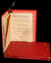 The book: THE FIRST MONTREAL IMPRINT. Attractive, beautifully bounded and scarce First Book printed in Montreal. Published by Fleury Mesplet (1734-1794), this physically tiny work would be the first work printed by Mesplet after his arrival in Montréal in 1776. After leaving Lyon for Avignon, London and Philadelphia, Mesplet settled in Montréal on the recommendation of Benjamin Franklin (1706-1790}, with whom he had collaborated on printing ventures for the American Congress. Mesplet’s luggage contained the first non-governmental press established in the “Province of Québec”. Mesplet published many utilitarian works, with this title being distributed to members of the Confrerie, who could boast a membership of 1000 in late-18th century Montréal. Mesplet would go on to found the La Gazette littéraire with journalist Valentin Jautard (1736-1787) (known by the pseudonym “le Spectacteur tranquille”) in 1778, but both would be thrown into prison without trial, which would put an abrupt end to their literary adventure. The wife of Mesplet, Marie Maribeau,(1746-1789) would take over the publishing reins during his imprisonment. Mesplet would establish the Gazette de Montréal in 1785, which would be bought by an Anglophone editor, eventually becoming the Montreal Gazette.
