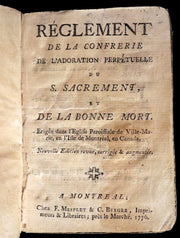1776 First Book printed in Montreal - Mesplet Reglement de la Confrerie de l'Adoration Perpetuelle du S Sacrement et de la Bonne Mort.