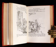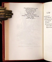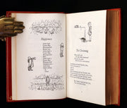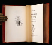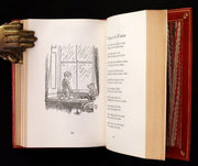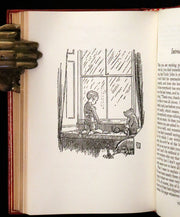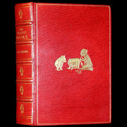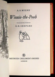 The book: "A 1973 beautifully bound omnibus edition of A. A. Milne's beloved Winnie-the-Pooh series, comprising ""When We Were Very Young,"" ""Winnie-the-Pooh,"" ""Now We Are Six,"" and ""The House at Pooh Corner."" This collection, published by Methuen Children's Books, London, is exquisitely bound by Bayntun-Riviere in red full morocco leather, making it a luxurious and collectible edition. The book includes all of Ernest H. Shepard's charming illustrations, which have become synonymous with the characters and stories of the Pooh series.