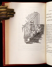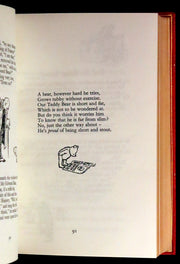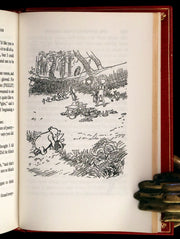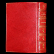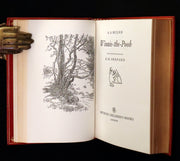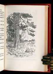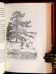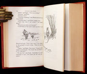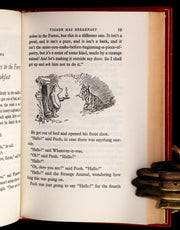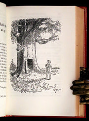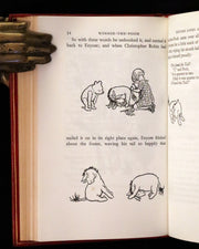 Binding: Attractive and fine binding, finely bound in red full morocco leather by Bayntun (Riviere), spine with raised bands, gilt lettered panel, the gilt device of Winnie-the-Pooh to the others and a beautiful gilt vignette of Pooh, Eeyore and Christopher Robin to the front board (hinges fine) under a protective removable mylar cover. All edges gilt. An exquisite binding for this Omnibus edition!