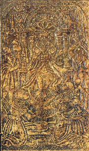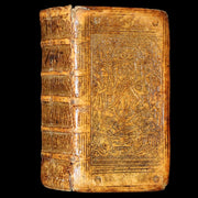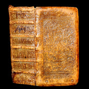 Binding: Attractive and very good contemporary full vellum binding with intricate blind-stamped designs on both boards and spine. The binding shows some wear and tear, especially on the edges and corners, but is overall well-preserved given its age (hinges worn but still tight, overall worn and scuffed - as shown) under a protective removable mylar cover.