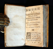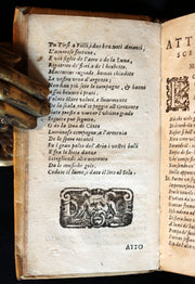 The book: Scarce early 17th-century edition of Guidubaldo Bonarelli's "Phyllis of Scyros" (Filli di Sciro) -- one of the highpoints of Italian drama and helped to define the pastoral mode. This quasi-elegiac tragicomedy was first performed in 1605 in the new ducal theater at Ferrara. In 1607 it was published under the auspices of the Academy of Intrepid Spirits (Accademia degli Intrepidi). "Phyllis" is a masterpiece of word-play, wit, wonderfully flowing verses, gentle musicality, parody, and irony. It was also groundbreaking for its moral and psychological portrayal of a character seized by a furious double passion - one of them incestuous. Bonarelli was forced to defend his work, and in his Discorsi he boldly claimed for poetry the right to treat life, love, death, furor, and ardor in their full complexity rather than as perfect ideals.