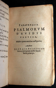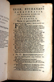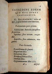 Binding: Good contemporary full calf leather binding, framed in double gilt fillet borders. The spine with five raised bands, gilt floral tooling within compartments, and gilt-lettered title “BVCHANANI / POEMATA.” (hinges fine, overall worn and scuffed mainly at corners - as shown) under a protective removable mylar cover. A pleasing 17th-century binding.