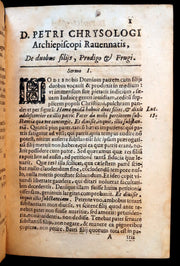 The book: Scarce 17th century edition of Chrysologus homilies. Archbishop Felix of Ravenna in the early eighth century collected and preserved 176 of his homilies. Various authors edited and translated these works into numerous languages. His sermons are historically significant in that they reveal Christian life in fifth-century Ravenna (Italy).