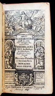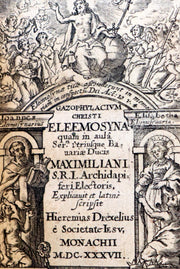 Title: GAZOPHYLACIUM CHRISTI ELEEMOSYNA. Quam in aula Ser.m utriusque Bavariae Ducis Maximiliani S.R.I. Archidapiferi Electoris, explicavit et latinè scripsit Hieremias Drexelius e Societate Iesu Monachii 1637.