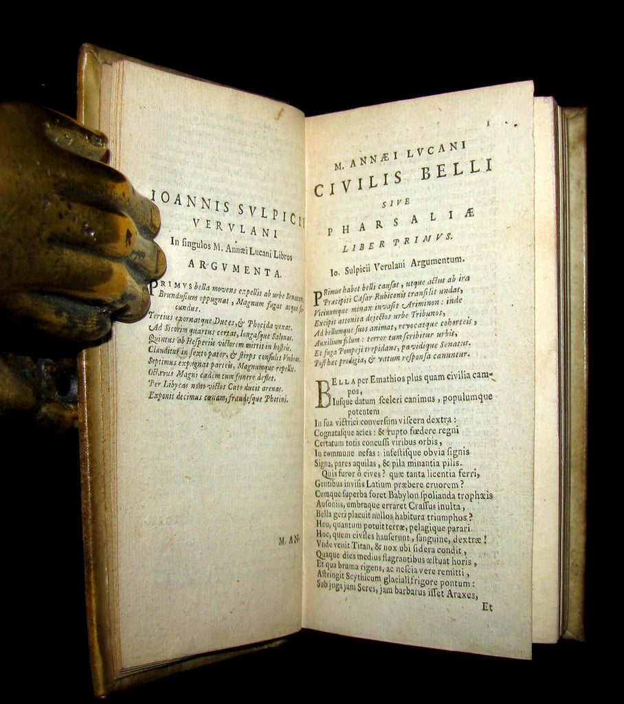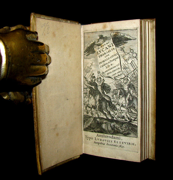 The book: Rare and attractive17th century edition of De Bello Civili ; On the Civil War), more commonly referred to as the Pharsalia, -- a Roman epic poem written by the poet Lucan, detailing the civil war between Julius Caesar and the forces of the Roman Senate led by Pompey the Great. The poem's title is a reference to the Battle of Pharsalus, which occurred in 48 BC, near Pharsalus, Thessaly, in northern Greece. Caesar decisively defeated Pompey in this battle, which occupies all of the epic's seventh book. In the early twentieth century, translator J. D. Duff, while arguing that "no reasonable judgment can rank Lucan among the world's great epic poets", notes that the work is notable for Lucan's decision to eschew divine intervention and downplay supernatural occurrences in the events of the story.