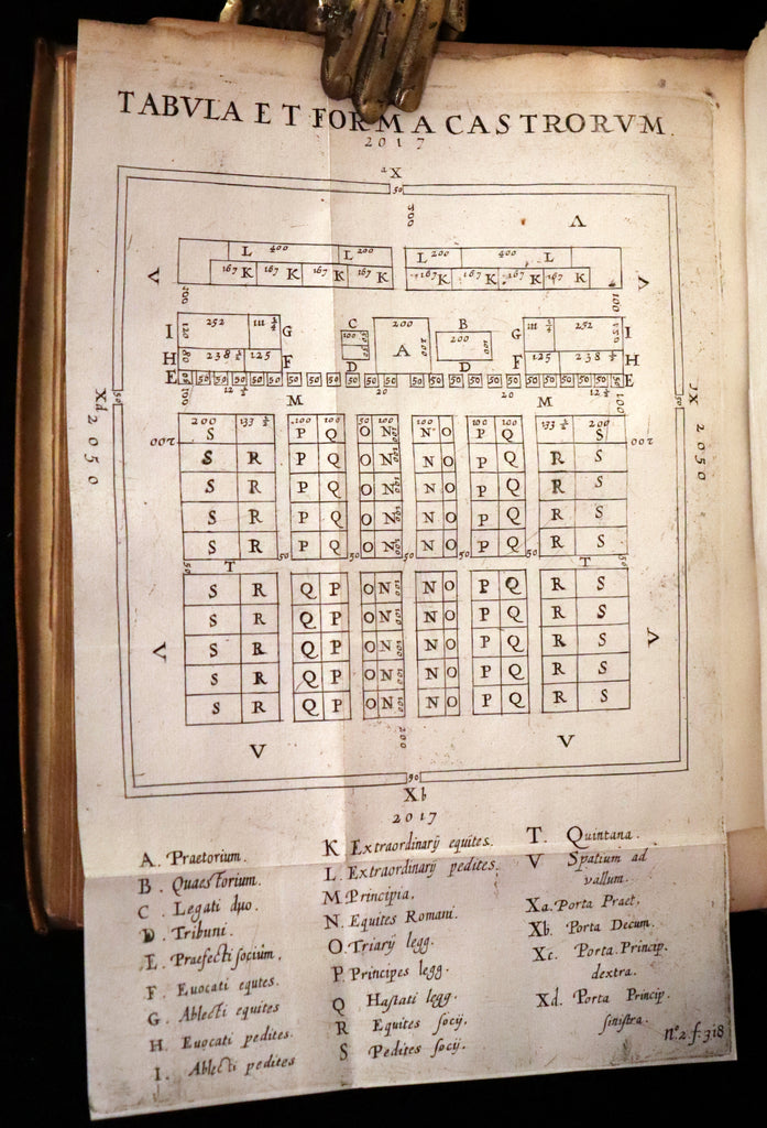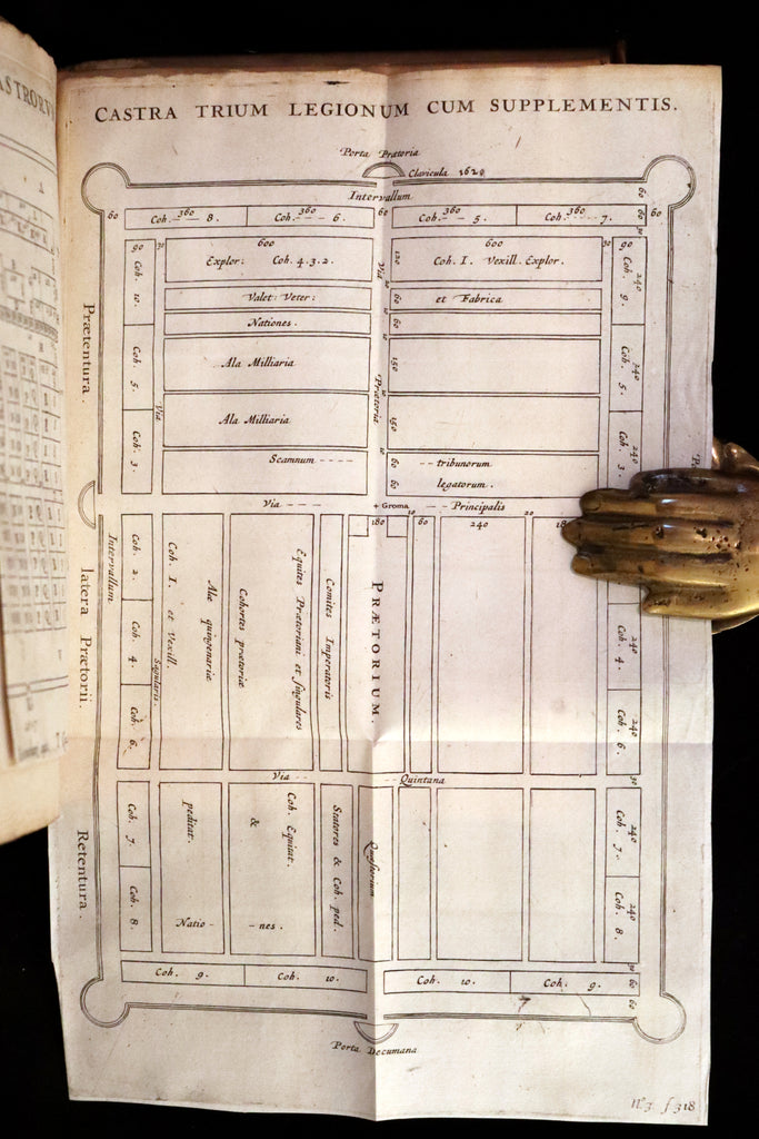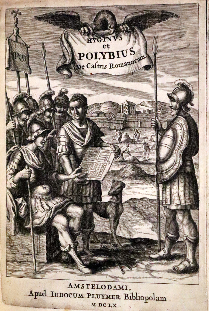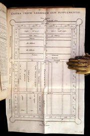 Illustrations: Complete with the engraved title page depicting depicts a Roman soldier who gives instructions for the building of a castrum and the 4 folding diagrams.