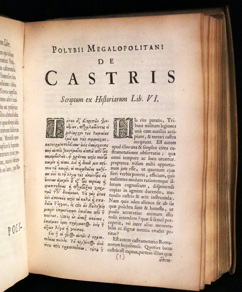 Scarce & Interesting work of Roman military technique, falsely attributed to Hyginus, a Latin author from the s. I BC, superintendent of the library on the Palatine who had been a slave until Augustus freed him. The other supposed author, the Greek Polybius, lived between the first centuries before Christ and after Christ. It is known that he wrote works of military technique that have not come down to us, and this is falsely attributed to him. The work contains fold-out states that show various plans of military camps. (ref.: Schweiger 2,466; Hoffmann 3,271; Brunet 3,394; Ebert 10139; Graesse 3,404).