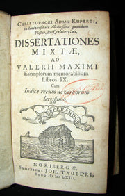 Title : Dissertationes Observationesq[ue] Mixtæ ad Valer. Maximum, et C. Vell. Paterculum. (2 books bound together) [Tl. 1] (Christophori Adami Ruperti Dissertationes mixtae ad Valerii Maximi Exemplorum memorabilium libres IX). [Tl. 2:] (Observationes historicae, politicae ... ad C. Velleji Paterculi Historiae Romanae libros II).