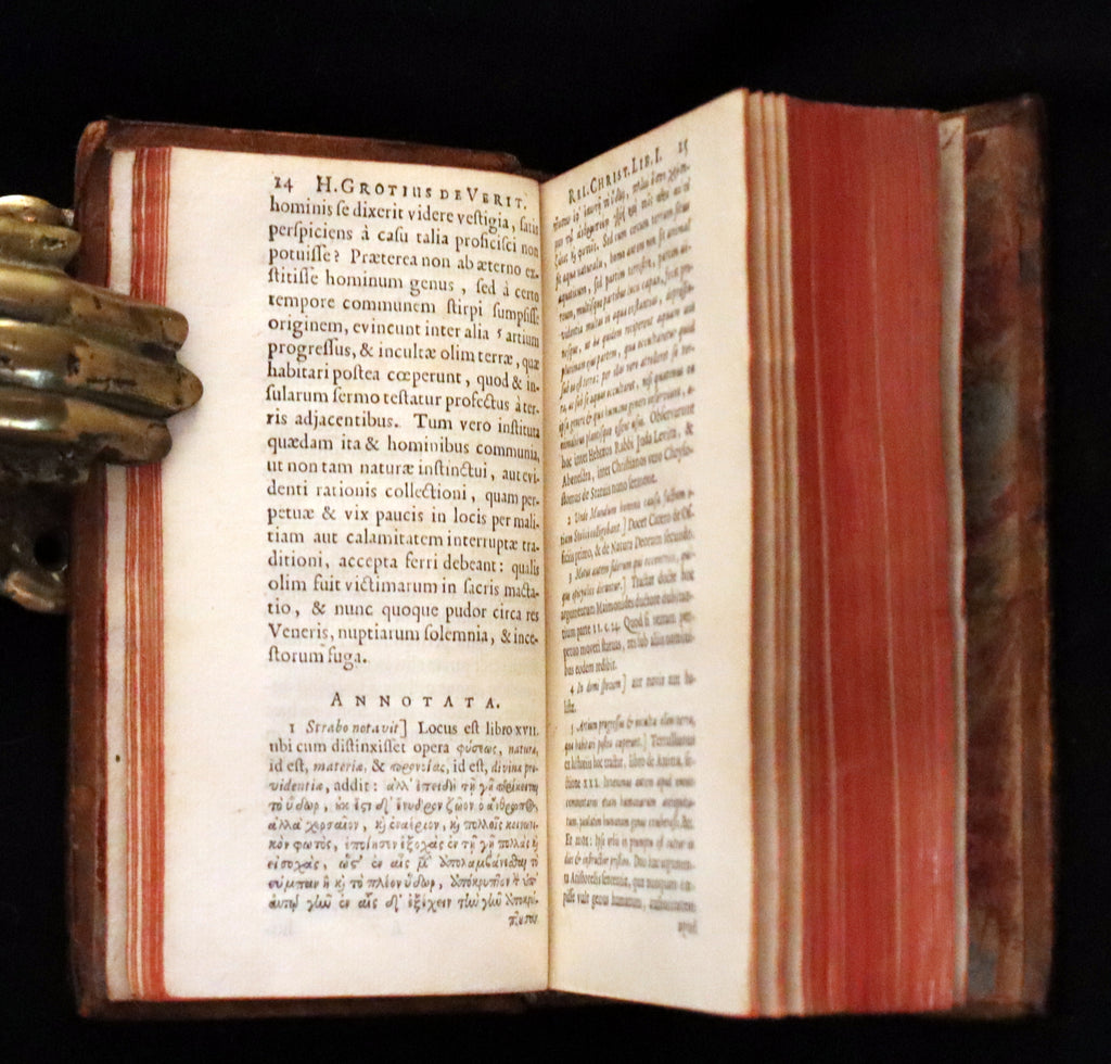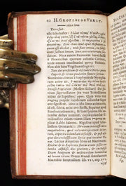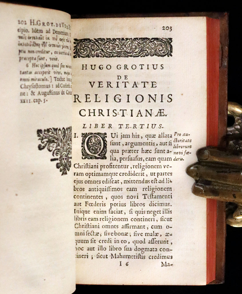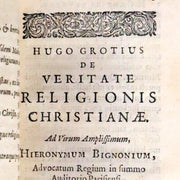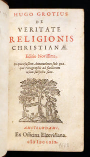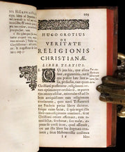 The book: Rare and attractive 17th-century edition of The Truth of the Christian Religion by Grotius - While in Paris, Grotius set about rendering into Latin prose a work which he had originally written as Dutch verse in prison, providing rudimentary yet systematic arguments for the truth of Christianity. The Dutch poem, Bewijs van den waren Godsdienst, was published in 1622, the Latin treatise in 1627, under the title De veritate religionis Christianae.