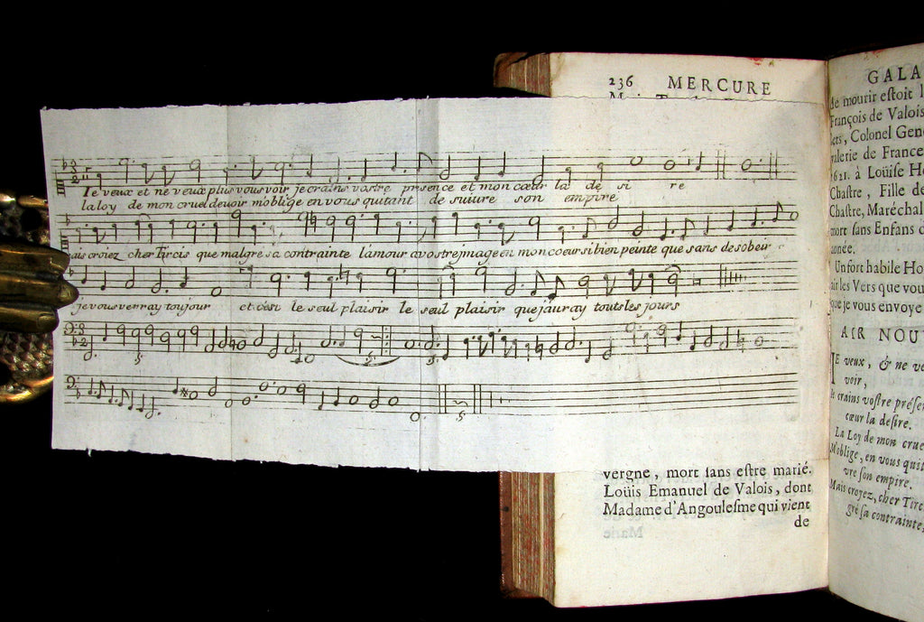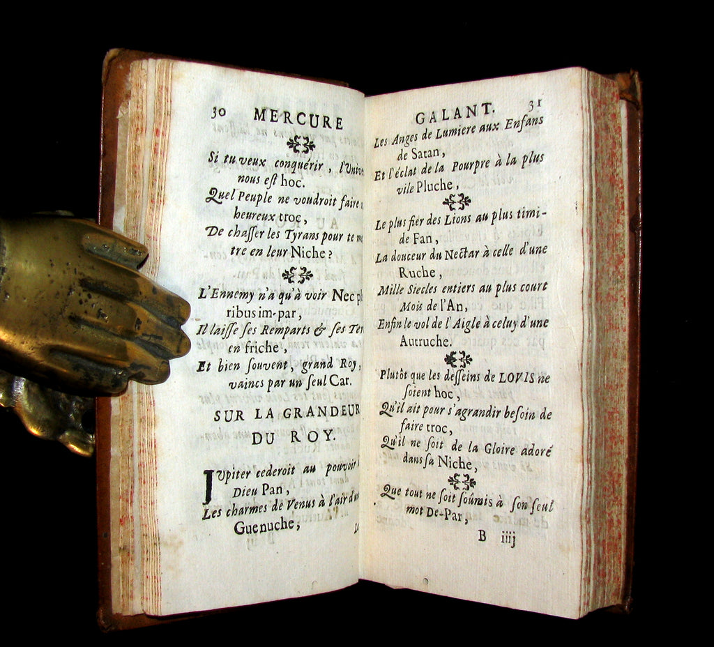 The book : Scarce 17th century edition of this Mercure galant founded by the writer Jean Donneau de Visé in 1672. The name refers to the god Mercury, the messenger of the gods; the title also echos the Mercure françoys which was France's first literary gazette, founded in 1611 by the Paris bookseller J. Richer. The magazine's goal was to inform elegant society about life in the court and intellectual/artistic debates; the gazette (which appeared irregularly) featured poems, anecdotes, news (marriages, gossip), theatre and art reviews, songs, and fashion reviews, and it became fashionable (and sometimes scandalous) to be mentioned in its pages.