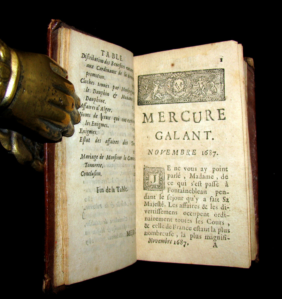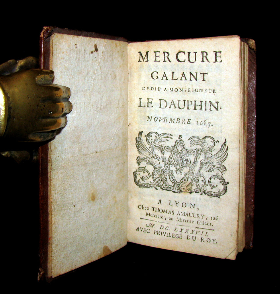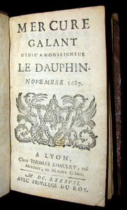 The book : Scarce 17th century edition of this Mercure galant founded by the writer Jean Donneau de Visé in 1672. The name refers to the god Mercury, the messenger of the gods; the title also echos the Mercure françoys which was France's first literary gazette, founded in 1611 by the Paris bookseller J. Richer. The magazine's goal was to inform elegant society about life in the court and intellectual/artistic debates; the gazette (which appeared irregularly) featured poems, anecdotes, news (marriages, gossip), theatre and art reviews, songs, and fashion reviews, and it became fashionable (and sometimes scandalous) to be mentioned in its pages.