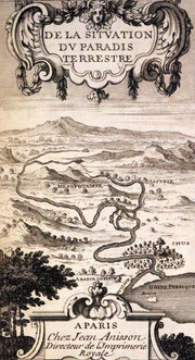 Illustrations: The book includes an engraved frontispiece depicting a geographical map of Mesopotamia, associated with the Garden of Eden, and a fold-out map titled "Carte de la Situation du Paradis Terrestre," including the mythic Chavilah/Havilah (In Genesis 2:10–11, Havilah is associated with the Garden of Eden).