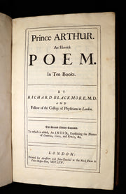 The book: Attractive and rare 17th-century second edition of this epic Poem - Prince Arthur, an Heroick Poem in X Books -- it appeared in 1695. Blackmore supported the Glorious Revolution, and Prince Arthur was a celebration of William III. The poem was based on the form of Virgil's The Aeneid and the subject matter of Geoffrey of Monmouth's Historia Regum Britanniae. It told of the Celtic King Arthur opposing the invading Saxons and taking London, which was a transparent encoding of William III opposing the "Saxon" James II and taking London. John Dennis derided the poem as being "servile" in its treatment of Geoffrey of Monmouth and having an inconsequential and fearful hero. Nevertheless, it went through three editions and William made Blackmore physician-in-ordinary (a position he would hold with Queen Anne as well), gave him a gold medal, and knighted him in 1697. In 1697, Blackmore followed that with King Arthur: an Heroic Poem in Twelve Books.