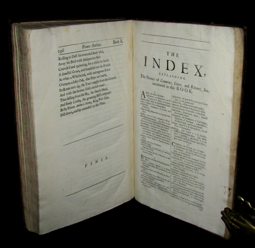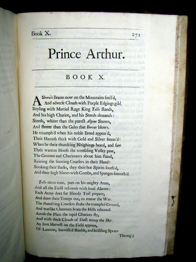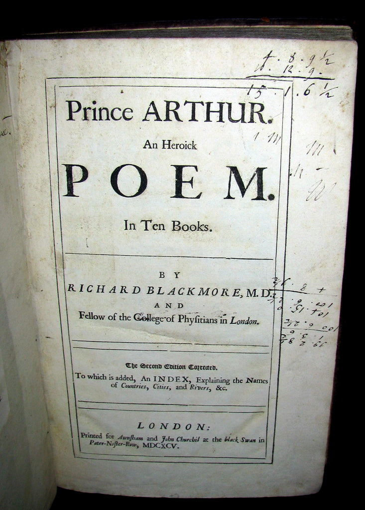 The book : Nice and rare 17th century second edition of this epic Poem - Prince Arthur, an Heroick Poem in X Books -- it appeared in 1695. Blackmore supported the Glorious Revolution, and Prince Arthur was a celebration of William III. The poem was based on the form of Virgil's The Aeneid and the subject matter of Geoffrey of Monmouth's Historia Regum Britanniae. It told of the Celtic King Arthur opposing the invading Saxons and taking London, which was a transparent encoding of William III opposing the "Saxon" James II and taking London. John Dennis derided the poem as being "servile" in its treatment of Geoffrey of Monmouth and having an inconsequential and fearful hero. Nevertheless, it went through three editions and William made Blackmore physician-in-ordinary (a position he would hold with Queen Anne as well), gave him a gold medal, and knighted him in 1697. In 1697, Blackmore followed that with King Arthur: an Heroic Poem in Twelve Books.