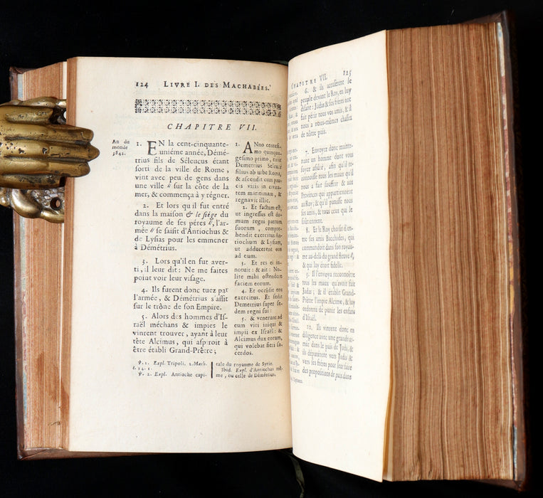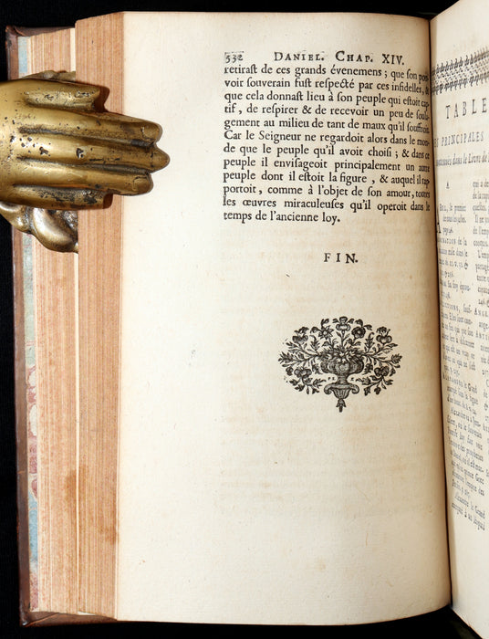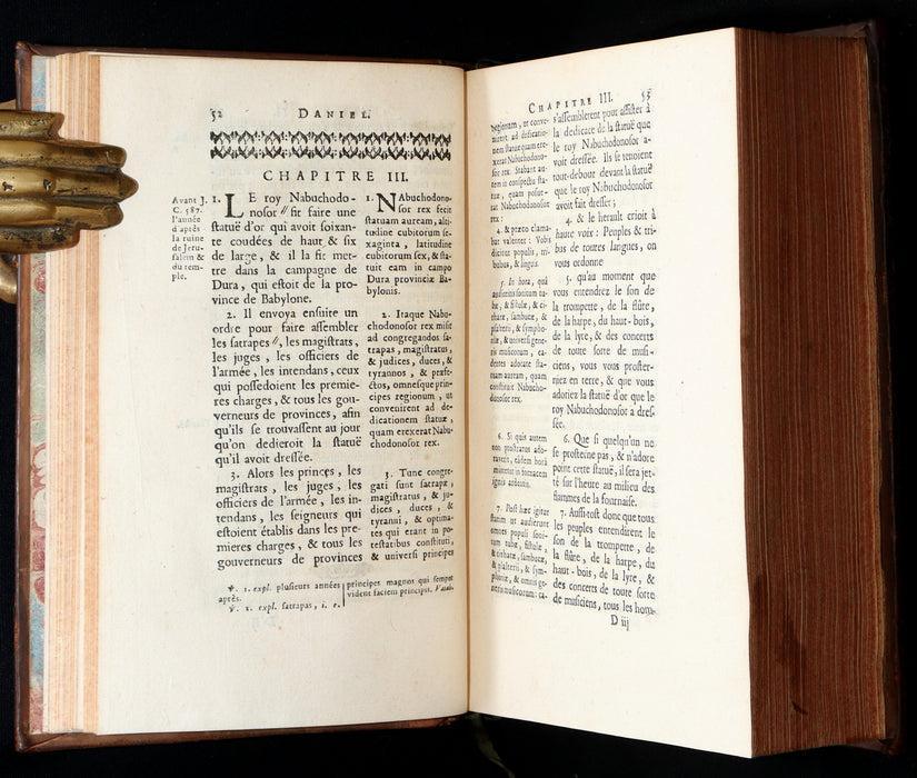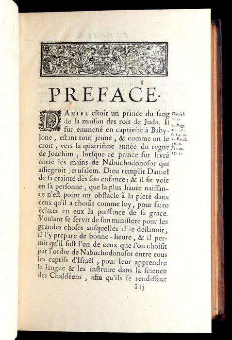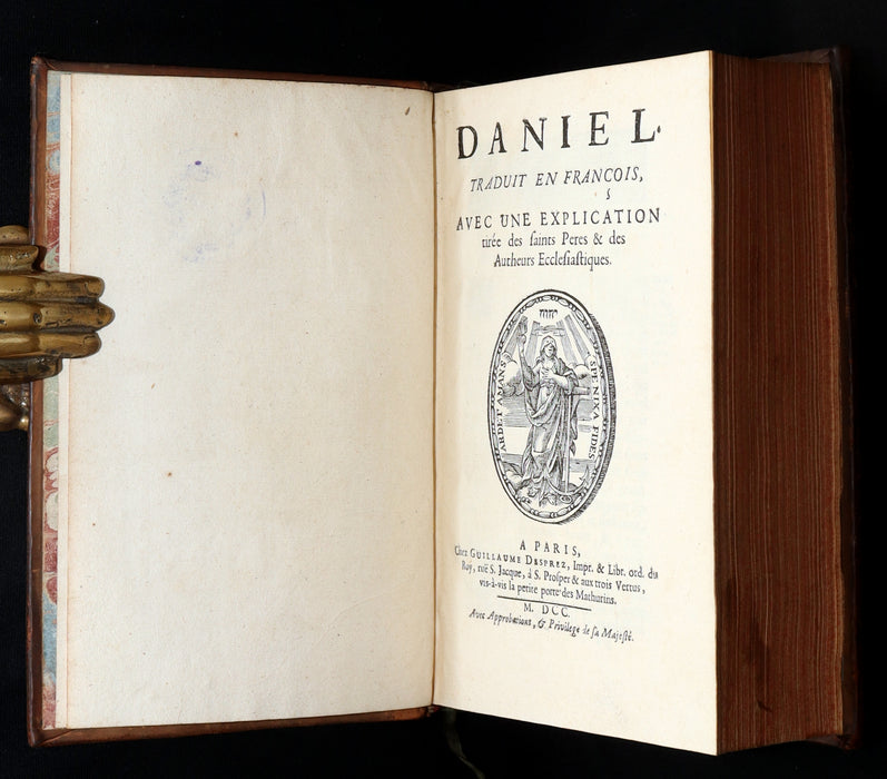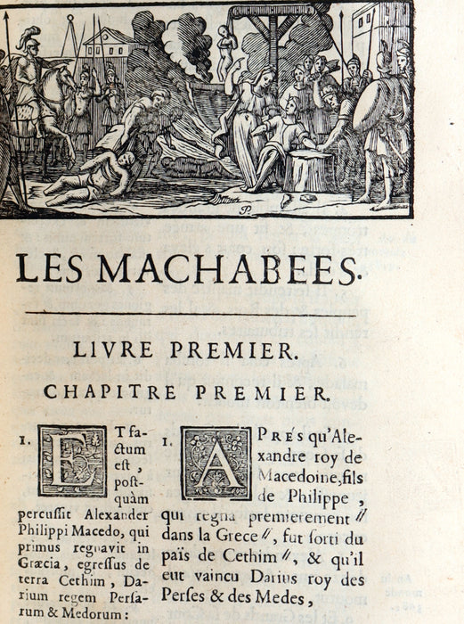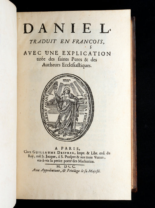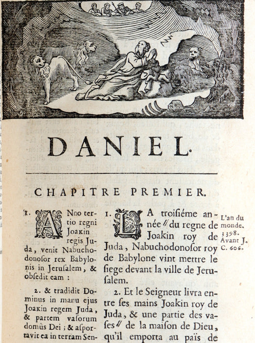 The book: A rare early 18th-century Parisian edition of the Books of Daniel and the Maccabees translated by the celebrated Port-Royal theologian Louis-Isaac Lemaistre de Sacy. This bilingual presentation — Latin scripture facing French translation — was intended for both liturgical use and private devotional study. The engraved vignettes and detailed woodcut scenes elevate the volume as a work of theological art and scholarship. Printed with royal privilege and ecclesiastical approbation, this edition is a fine example of early 18th-century French religious publishing.