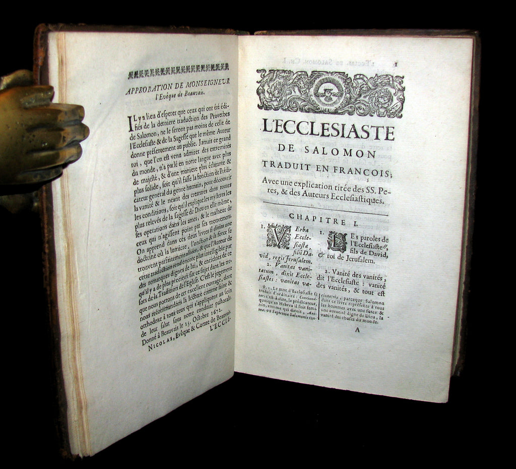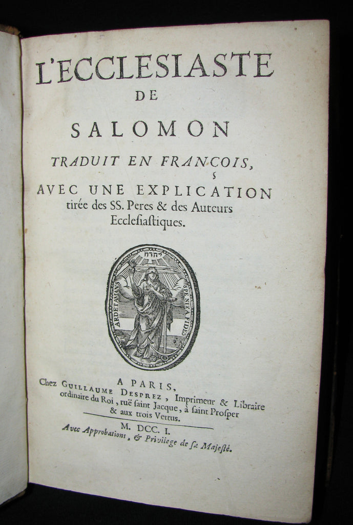 The book : Original 1701 French Latin edition of Ecclesiastes -- one of 24 books of the Tanakh (Hebrew Bible), where it is classified as one of the Ketuvim (Writings). Originally written c. 450–200 BCE, it is also among the canonical Wisdom literature of the Old Testament in most denominations of Christianity. The title Ecclesiastes is a Latin transliteration of the Greek translation of the Hebrew Kohelet (also written as Koheleth or Qoheleth), the pseudonym used by the author of the book.