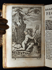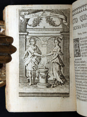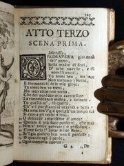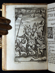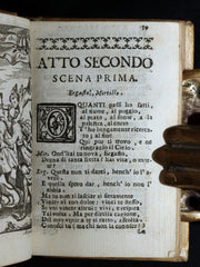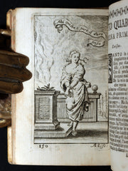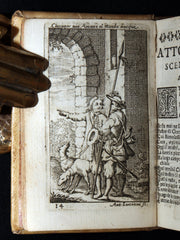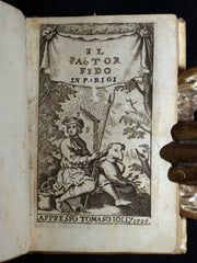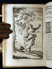 The book: This charming miniature-format 1706 Paris edition of Il Pastor Fido presents Guarini’s celebrated pastoral tragicomedy in an elegant and highly collectible pocket size. The drama, set in Arcadia, intertwines themes of love, sacrifice, and prophecy as shepherds and nobles confront the dictates of fate and the trials of constancy in love. The finely engraved plates enhance the theatrical and mythological atmosphere, depicting key moments of emotional tension and pastoral beauty. Such small-format early eighteenth-century editions were designed for private reading and portability, and their survival in contemporary vellum bindings adds to their historical and aesthetic appeal.