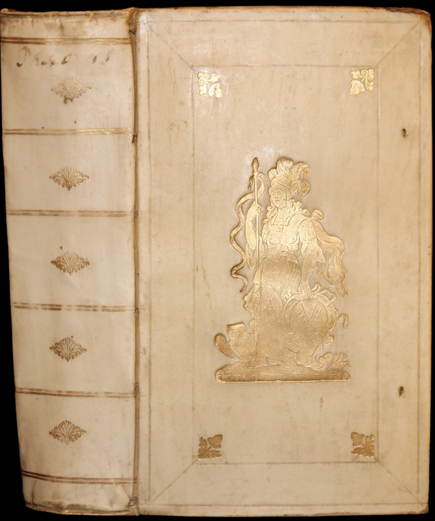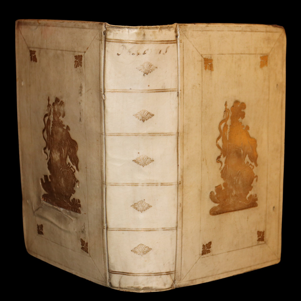 Binding: Attractive and very good original gilt decorated full vellum binding (hinges fine, overall slightly worn and scuffed - as shown, small tear repaired by a previous owner on the rear cover - as shown ) under a protective removable mylar cover. A very nice binding!