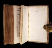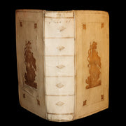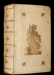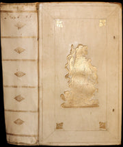 Binding: Attractive and very good original gilt decorated full vellum binding (hinges fine, overall slightly worn and scuffed - as shown, small tear repaired by a previous owner on the rear cover - as shown ) under a protective removable mylar cover. A very nice binding!