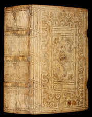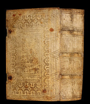 Binding: Attractive and very good original blind decorated full vellum leather binding (hinges fine, overall worn and scuffed - as shown, missing the clasps - as shown ) under a removable protective mylar cover.