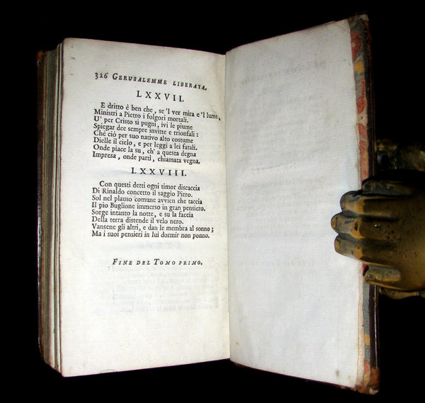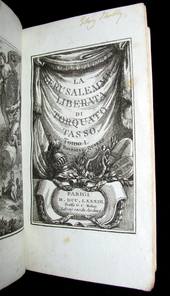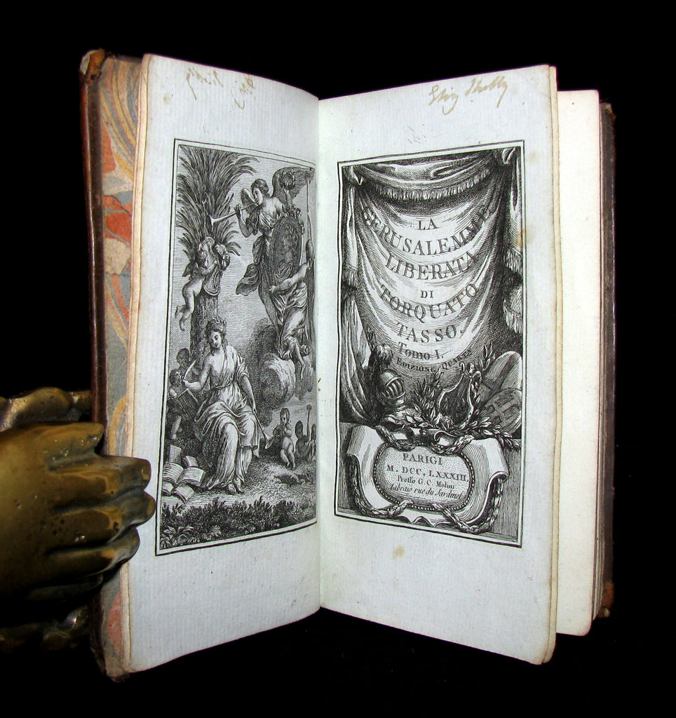 The book : A rare 18th century Italian book set published in Paris of Jerusalem Delivered, also known as The Liberation of Jerusalem (Italian: La Gerusalemme liberata), is an epic poem by the Italian poet Torquato Tasso, first published in 1581, that tells a largely mythified version of the First Crusade in which Christian knights, led by Godfrey of Bouillon, battle Muslims in order to take Jerusalem. The poem is composed of 1,917 stanzas in ottava rima (15,336 hendecasyllabic lines), grouped into twenty cantos of varying length.
