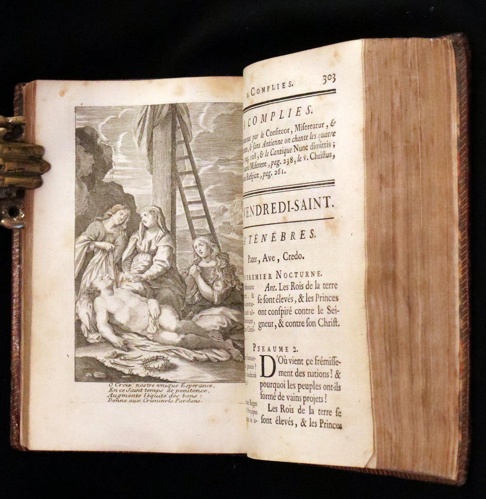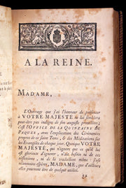 The book: Attractive and scarce 18th-century French-Latin edition of Office de la quinzaine de Paques (Easter Prayer - Office of the Easter Fortnight, For the use of Rome, in Latin and French. New Translation. Dedicated to the Queen in a very nice and beautiful bindery work.