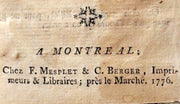 Publisher: Montréal, F. Mesplet & C. Berger, 1776. Casey, Catalogue of Pamphlets 1536; Dionne 18; Lande, Rare Canadiana 153 ("considered the first Canadian imprint in Montreal"); Tremaine 231. An earlier edition of this work is believed to have been prepared by Mesplet in Philadelphia. He had emigrated to America on the advice of Franklin, and had moved from Philadelphia to Montreal in 1776 when commissioned by the Continental Congress to accompany Franklin, Chase and Carroll for the purpose of establishing a French press.