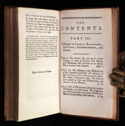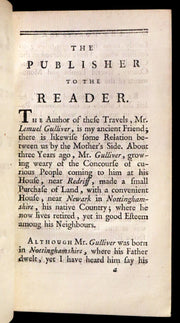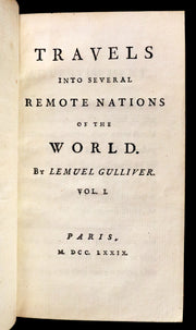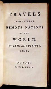 The books: Rare and attractive 2 volumes 18th-century edition printed in Paris of Gulliver's Travels, or Travels into Several Remote Nations of the World. In Four Parts. By Lemuel Gulliver, First a Surgeon, and then a Captain of Several Ships, (which is the full title), -- a prose satire by Irish writer and clergyman Jonathan Swift, that is both a satire on human nature and the "travelers' tales" literary subgenre. It is Swift's best known full-length work and a classic of English literature. He himself claimed that he wrote Gulliver's Travels "to vex the world rather than divert it".