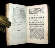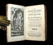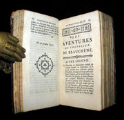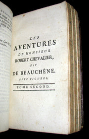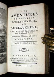 The book : Scarce 18th century French edition of Le Sage's Adventures of Mr. Robert Chevalier De Beauchêne Captain of Flibustiers - (Pirates) in New France. Purporting to be the authentic memoirs of the soldier, adventurer and privateer Beauchêne, after the manuscript communicated by his widow to Lesage, but probably greatly amplified and modified by the latter. Although the authenticity of the memoirs has been disputed, there is no doubt as to the real historical existence of the swashbuckling hero, who was born near Montreal. "The Chevalier de Beauchêne, Indian Scout and pirate, ranged over large portions of North America. At one point he set out for Detroit with Cadillac, who, when he discovered that Beachêne was carrying too much eau-de-vie, returned the Chevalier to Montreal and prison." (Lande) The publisher's preface states that Beauchêne, having amassed a small fortune in privateering, went to France where he squandered it all and was killed in a brawl in Tours. His death certificate, dated Dec. 11, 1731, has in fact been found in the parish registers of that city.