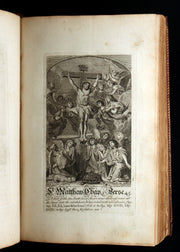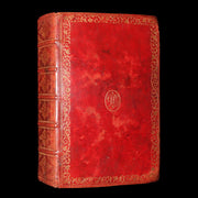 Binding: Very good Splendid contemporary full red morocco binding, richly gilt-tooled on boards and spine, featuring an elegant scrolling border and a central gilt monogram cartouche (likely original ownership initials). Raised bands with finely tooled gilt compartments (hinges fine, overall slightly worn and scuffed - as shown) under a protective removable mylar cover. All edges gilt. Attractive early marbled endpapers (brocade-style) with additional prayer leaf pasted at the rear. Minor rubbing, some patina and small marks consistent with age, but overall a very handsome and imposing 18th-century devotional binding.