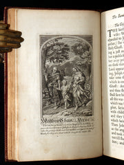 This copy stands out not only for its stately full red morocco gilt binding—a luxury presentation typical of a distinguished household—but also for its deeply layered provenance. The engraved memorial bookplate for Leonard Kopp (1785) and the extensive manuscript family register (1771–1806) reveal a long line of custodians who treated the volume as both a liturgical tool and a family record. Such combined spiritual and genealogical roles were common in 18th-century England, but few survive in such cohesive and appealing condition.