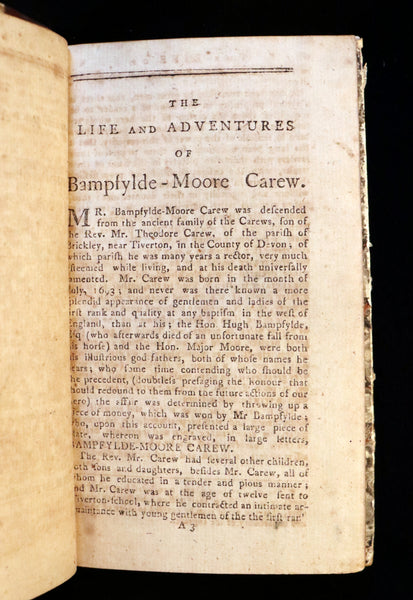 The book: Scarce and attractive edition of The Life and Adventures of Bampfylde Moore Carew. Carew claims to have taken to the road after he ran away from Blundell's School in Tiverton. With friends, he chased a deer through fields causing damage, which caused farmers to complain to the headmaster. Carew ran away and, at an alehouse, fell in with a band of “gypsies”. (These were almost certainly not Romany but vagabonds living off their wits.) Carew travelled widely, at first around Devon and then around England, supporting himself by playing confidence tricks on the wealthy.