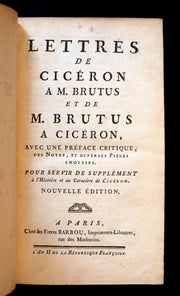 The book: Rare and attractive Latin-French 18th-century edition of Letters of Cicero to Brutus -- Epistulae ad Brutum (Letters to Brutus) is a collection of letters between Roman politician and orator Marcus Tullius Cicero and fellow politician, and conspirator against Julius Caesar, Marcus Junius Brutus.