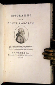 The book : A beautifully bound edition of EPIGRAMMI DEL CONTE RONCALLI, this collection showcases the poetic prowess of Conte Carlo Roncalli. This particular copy holds special significance due to the inclusion of manuscript pages by the renowned Italian Archeologist Michelangelo Lanci, making it a unique and valuable piece for collectors and enthusiasts of Italian literature and history.