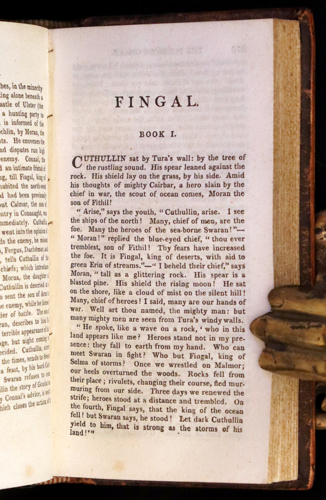 The book: Rare and attractive first J. Walker edition of the Poems of Ossian - Ossian is the narrator and purported author of a cycle of epic poems published by the Scottish poet James Macpherson from 1760. Macpherson claimed to have collected word-of-mouth material in Gaelic, said to be from ancient sources, and that the work was his translation of that material. Ossian is based on Oisín, son of Finn or Fionn mac Cumhaill, anglicised to Finn McCool, a legendary bard who is a character in Irish mythology. Contemporary critics were divided in their view of the work's authenticity, but the consensus since is that Macpherson framed the poems himself, based on old folk tales he had collected.