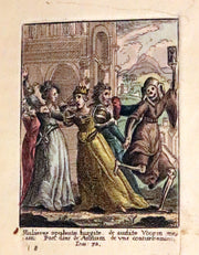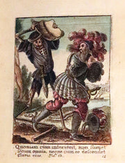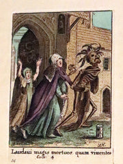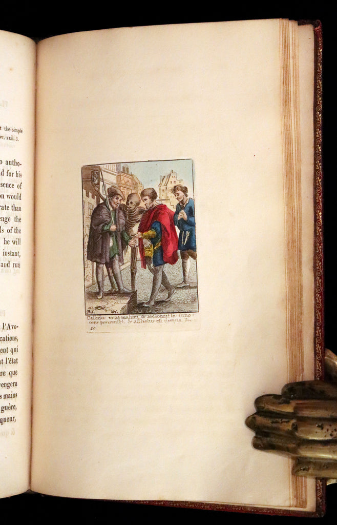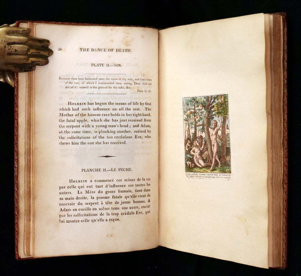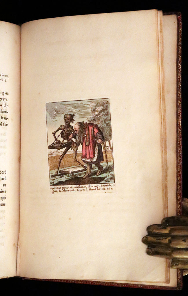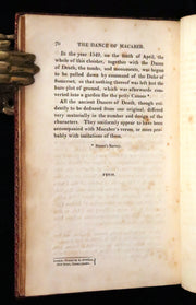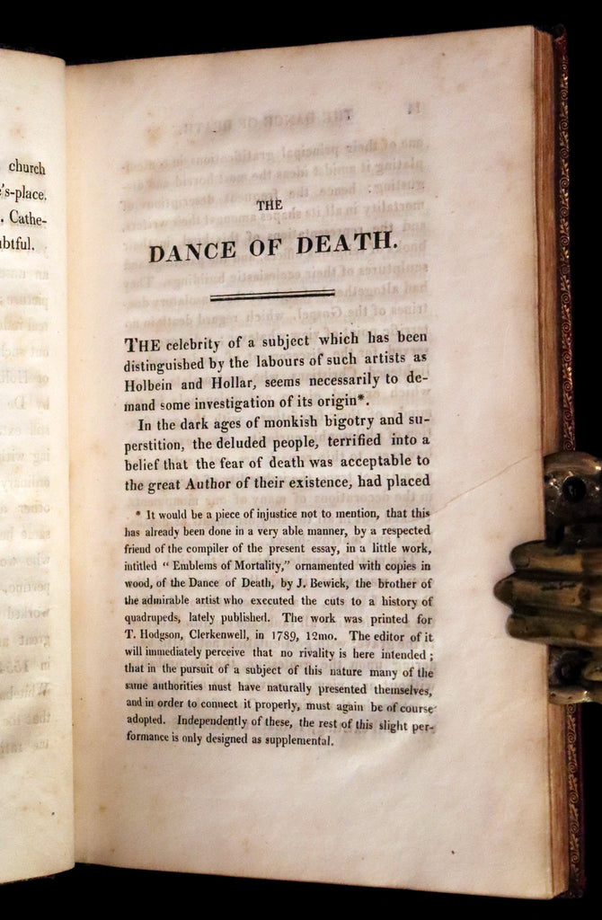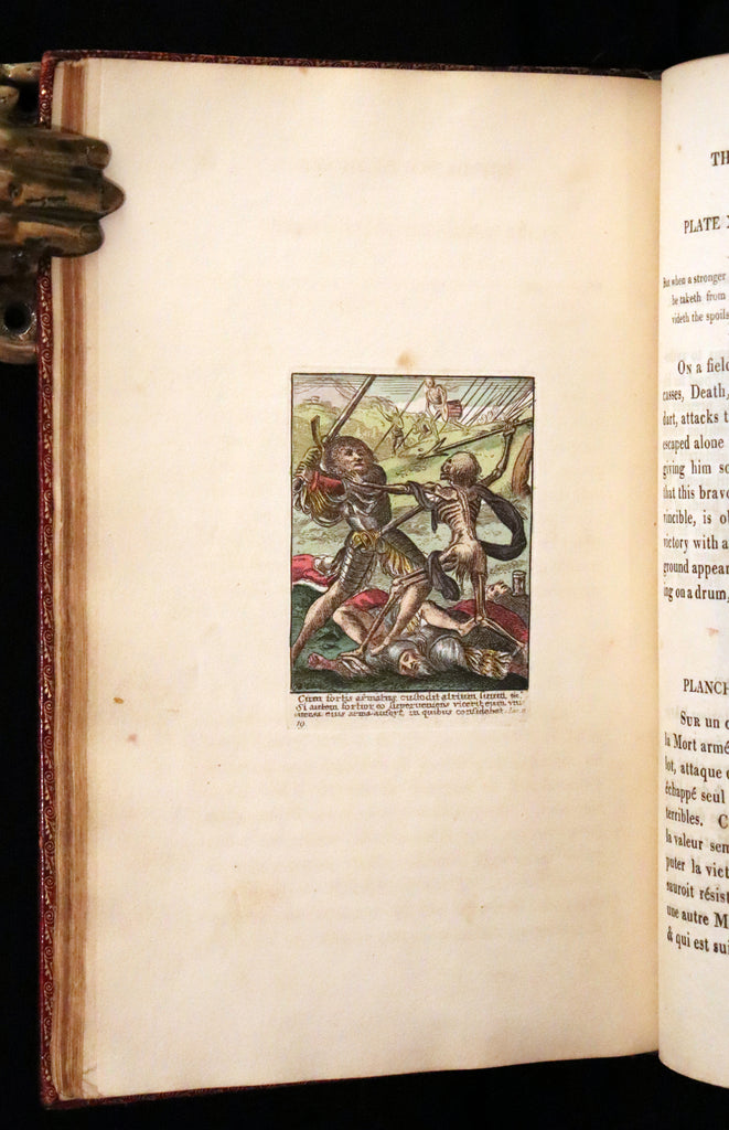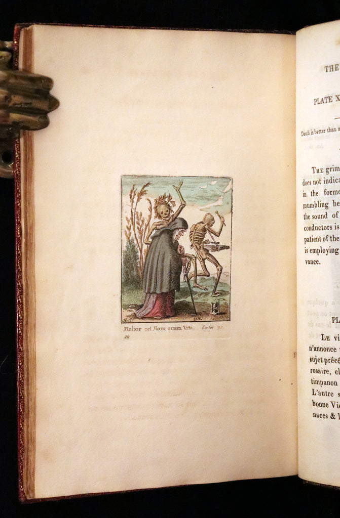 The book: Rare and attractive 1816 color edition of The Danse Macabre (from the French language), also called the Dance of Death, -- an artistic genre of allegory of the Late Middle Ages on the universality of death: no matter one's station in life, the Danse Macabre unites all. The Danse Macabre consists of the dead or a personification of death summoning representatives from all walks of life to dance along to the grave, typically with a pope, emperor, king, child, and laborer. It was produced as memento mori, to remind people of the fragility of their lives and how vain were the glories of earthly life. Its origins are postulated from illustrated sermon texts; the earliest recorded visual scheme was a now-lost mural at Holy Innocents' Cemetery in Paris dating from 1424 to 1425.
