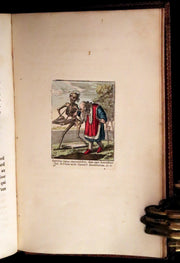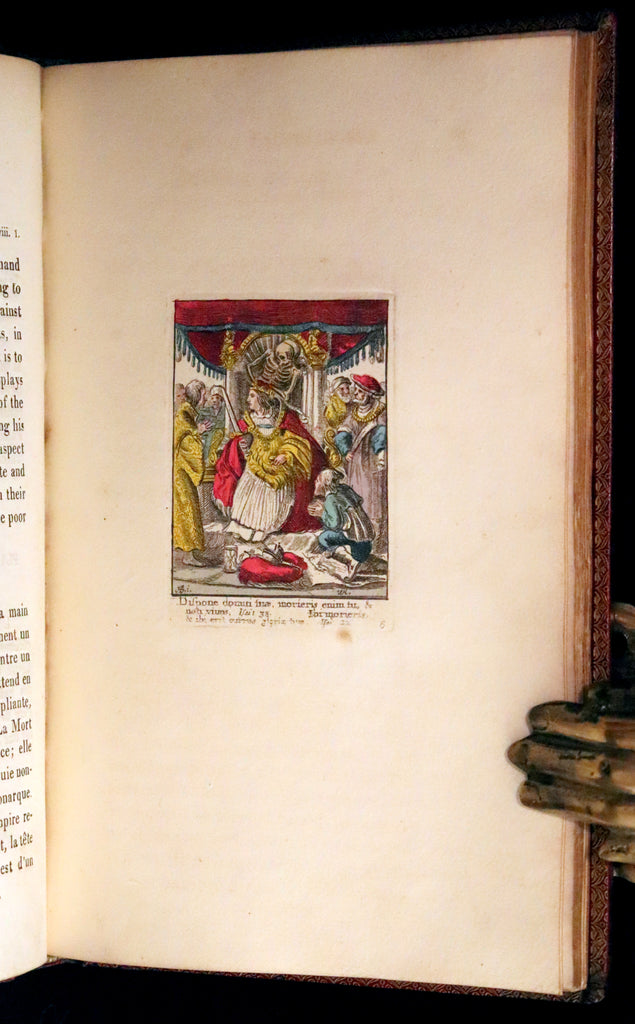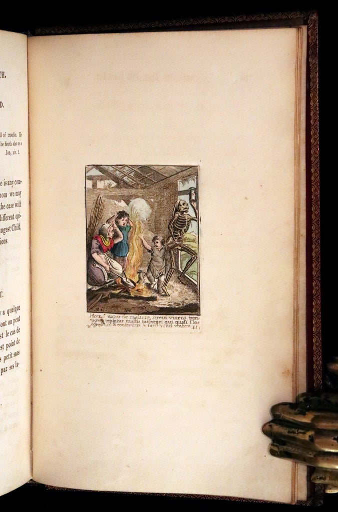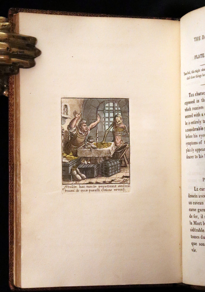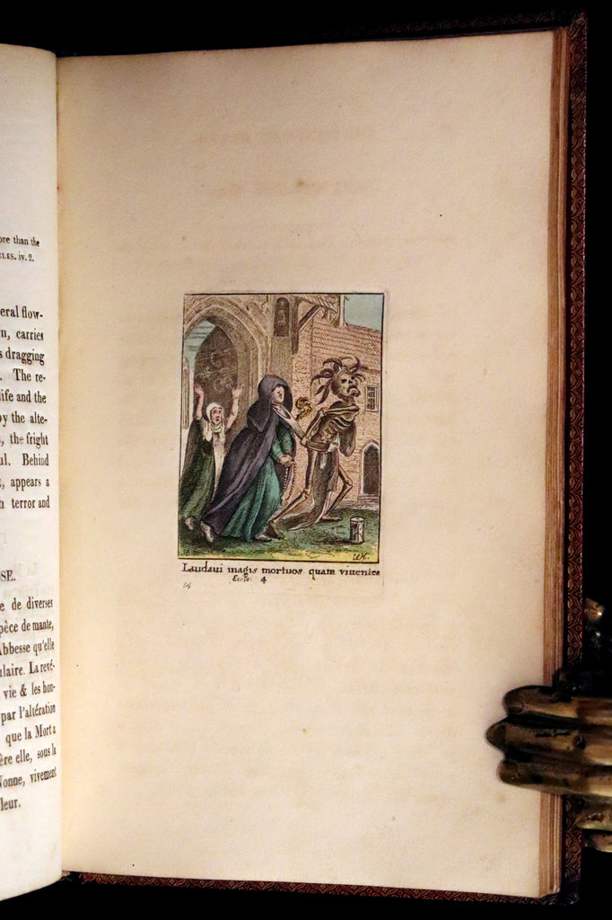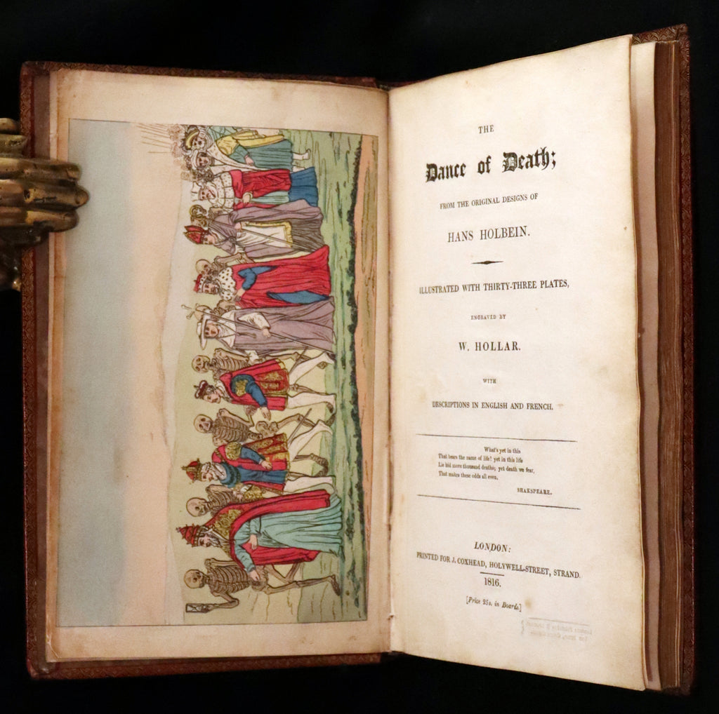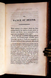 The book: Rare and attractive 1816 color edition of The Danse Macabre (from the French language), also called the Dance of Death, -- an artistic genre of allegory of the Late Middle Ages on the universality of death: no matter one's station in life, the Danse Macabre unites all. The Danse Macabre consists of the dead or a personification of death summoning representatives from all walks of life to dance along to the grave, typically with a pope, emperor, king, child, and laborer. It was produced as memento mori, to remind people of the fragility of their lives and how vain were the glories of earthly life. Its origins are postulated from illustrated sermon texts; the earliest recorded visual scheme was a now-lost mural at Holy Innocents' Cemetery in Paris dating from 1424 to 1425.