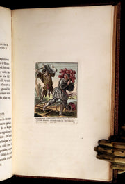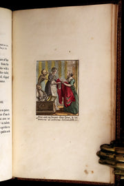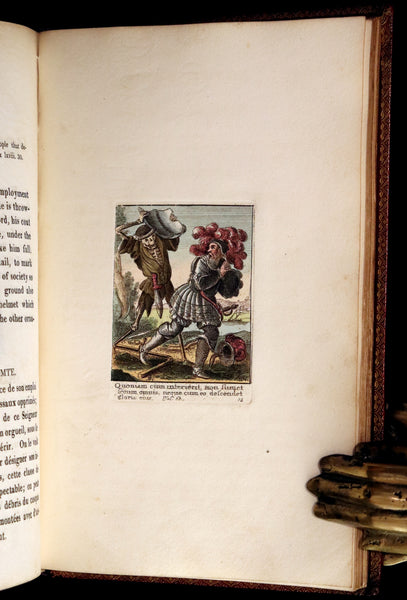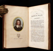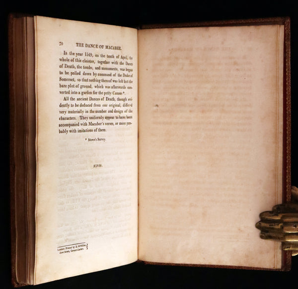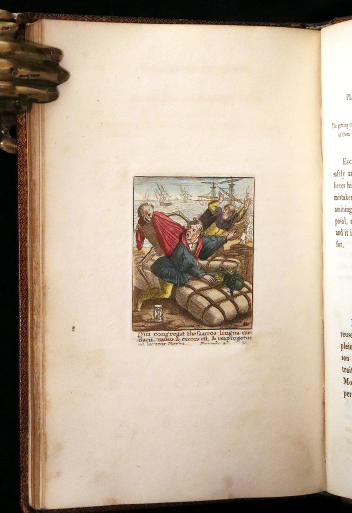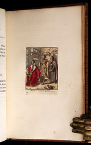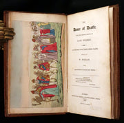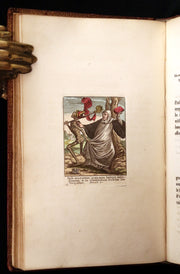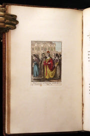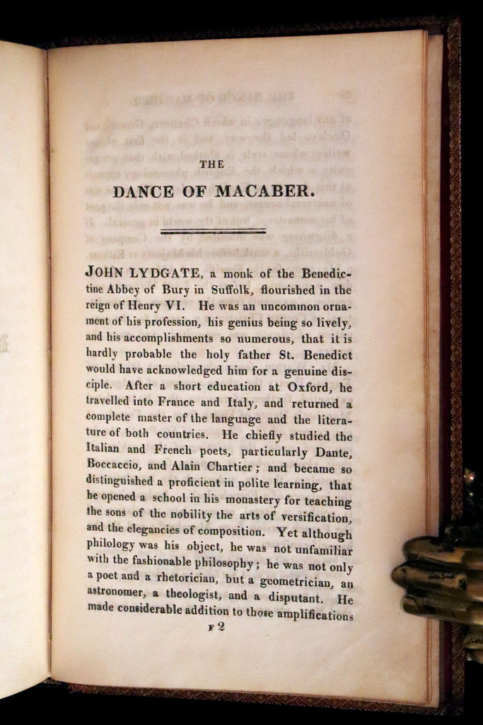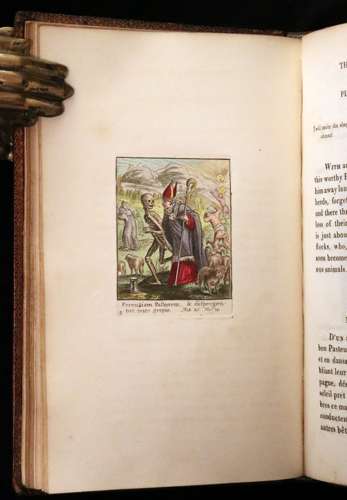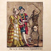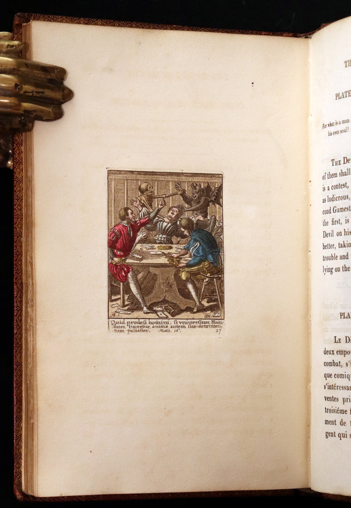 The book: Rare and attractive 1816 color edition of The Danse Macabre (from the French language), also called the Dance of Death, -- an artistic genre of allegory of the Late Middle Ages on the universality of death: no matter one's station in life, the Danse Macabre unites all. The Danse Macabre consists of the dead or a personification of death summoning representatives from all walks of life to dance along to the grave, typically with a pope, emperor, king, child, and laborer. It was produced as memento mori, to remind people of the fragility of their lives and how vain were the glories of earthly life. Its origins are postulated from illustrated sermon texts; the earliest recorded visual scheme was a now-lost mural at Holy Innocents' Cemetery in Paris dating from 1424 to 1425.