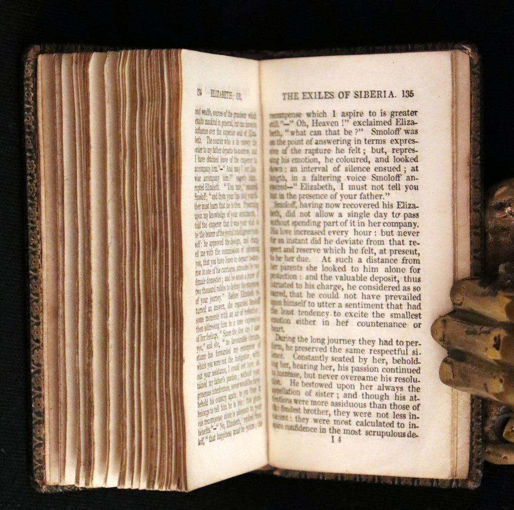 The book: A rare and very good early 19th-century miniature edition of ELIZABETH: OR, THE EXILES OF SIBERIA, a gripping tale founded on true events, presented in Jones's University Edition. This compact miniature volume, beautifully bound in full calf with decorative gilt to the spine, is an appealing addition to any library or collection of miniaturized literature.